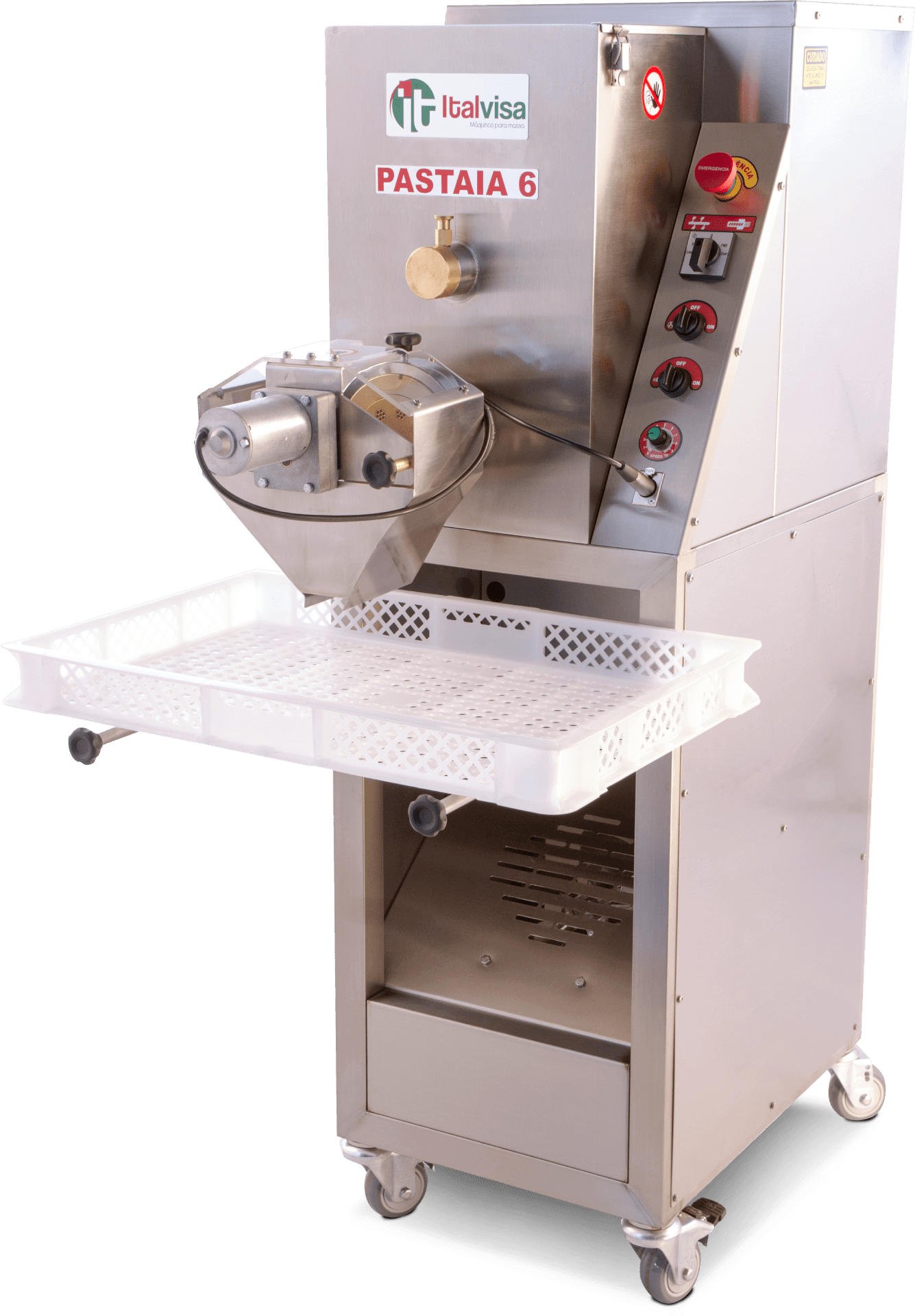 Máquina para massa fresca com sistema de segurança, sistema de refrigeração do cabeçote extrusor, ventilador para pré-secagem da massa e cortador automático regulável.